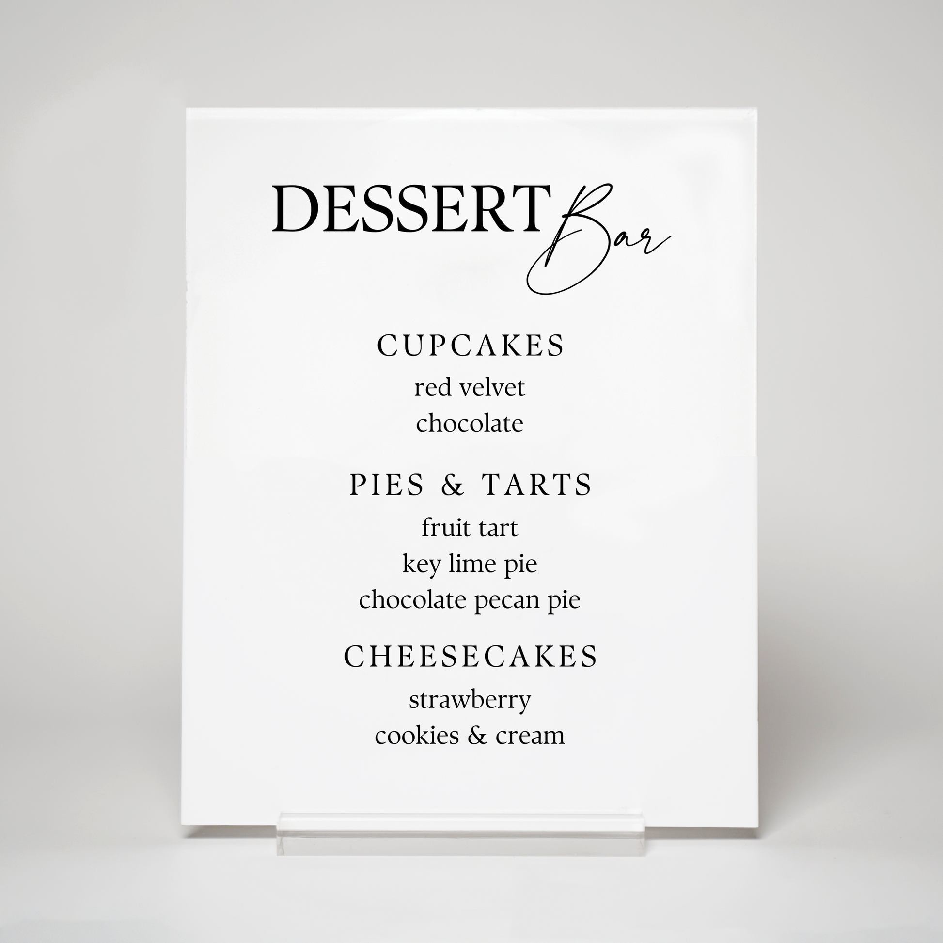 Add a special touch to your dessert table with this customizable 8" x 10" acrylic dessert menu sign.